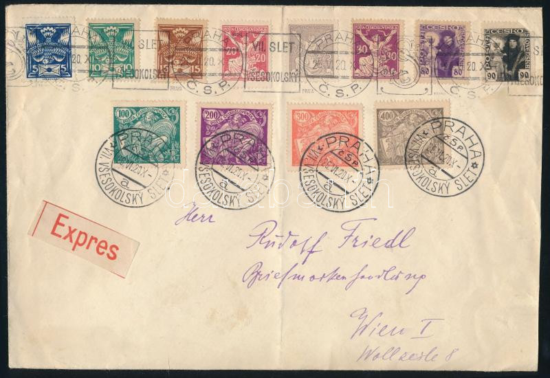 Csehszlovákia 1920 Szokol ünnepség alkalmi bélyegzésű nagyalakú expressz levél Bécsbe