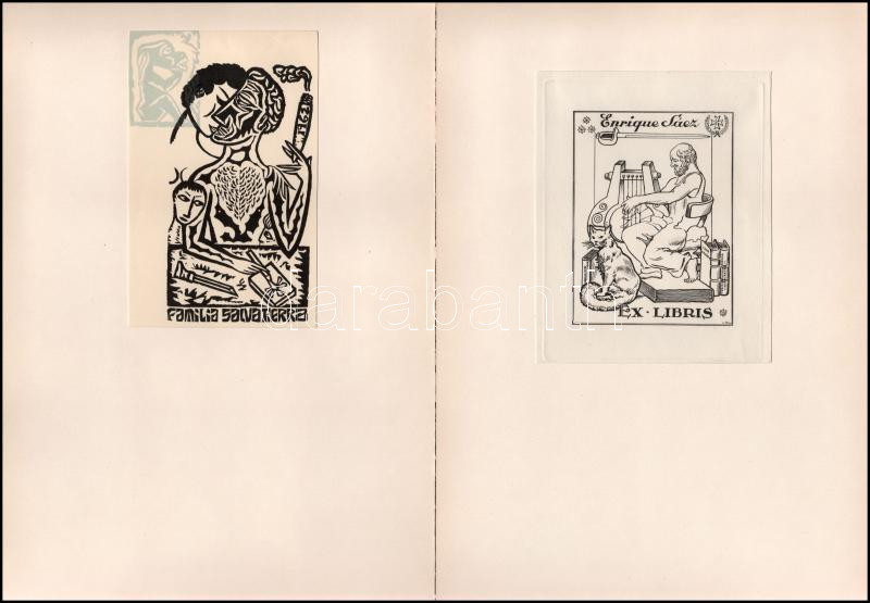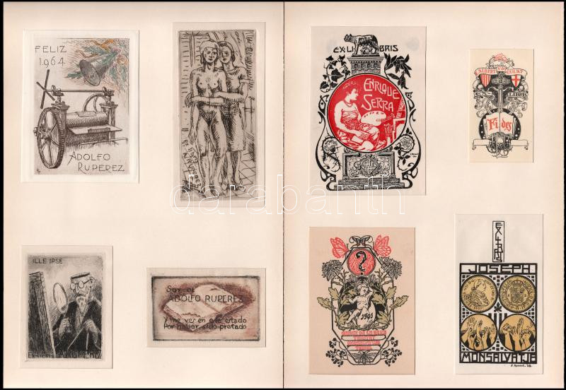 Klf. alkotók (GarcÃa Joaquim Renart, L. Remo, Dolfo Ruperez, Julio César Salvatierra): 10 db ex libris és kisgrafika (közte egy db erotikus). Klf. technikák, papÃr, jelzett a metszeten, klf. méretekben. 4 db paszpartuban.