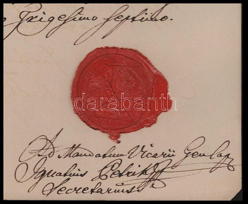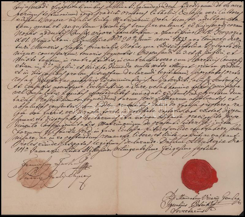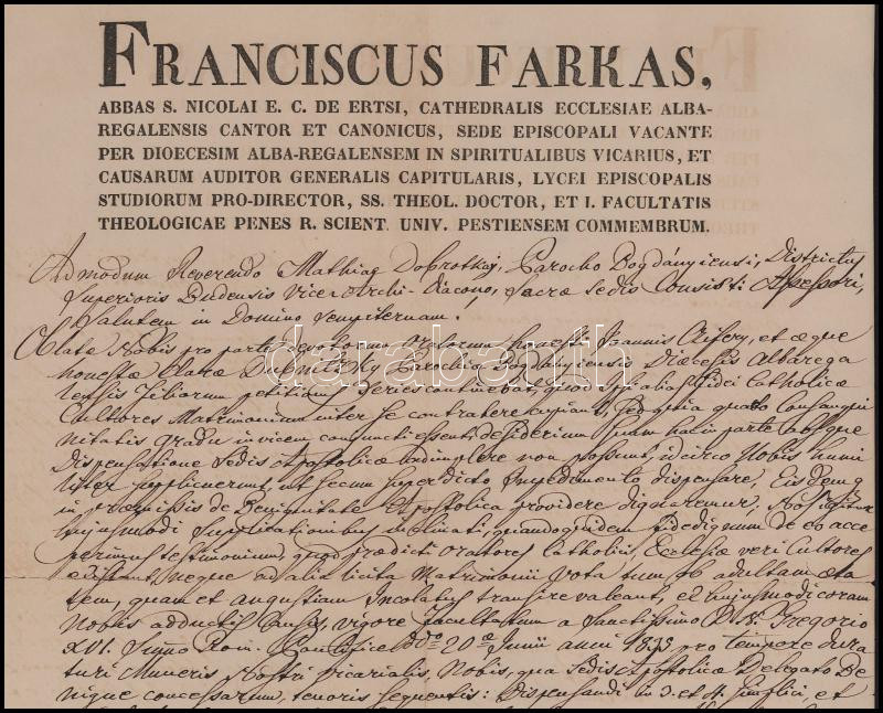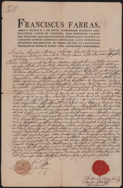 1837 Farkas Ferenc (1786-1864) székesfehérvári kanonok (1838-tól nagyprépost) autográf aláírásával ellátott latin nyelvű egyházi okirat, viaszpecséttel, kisebb sérülésekkel