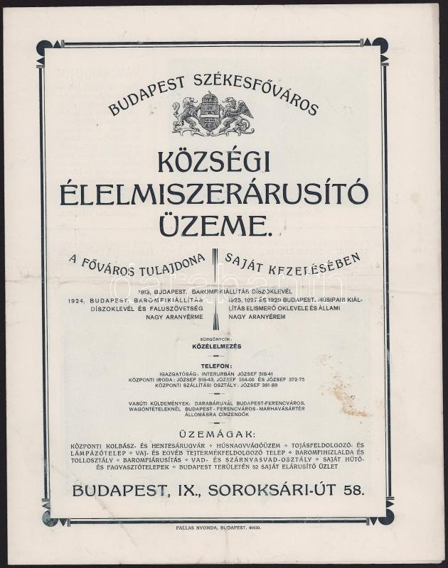 cca 1929 Budapest Székesfőváros Községi Élelmiszerárusító Üzeme, feket...
