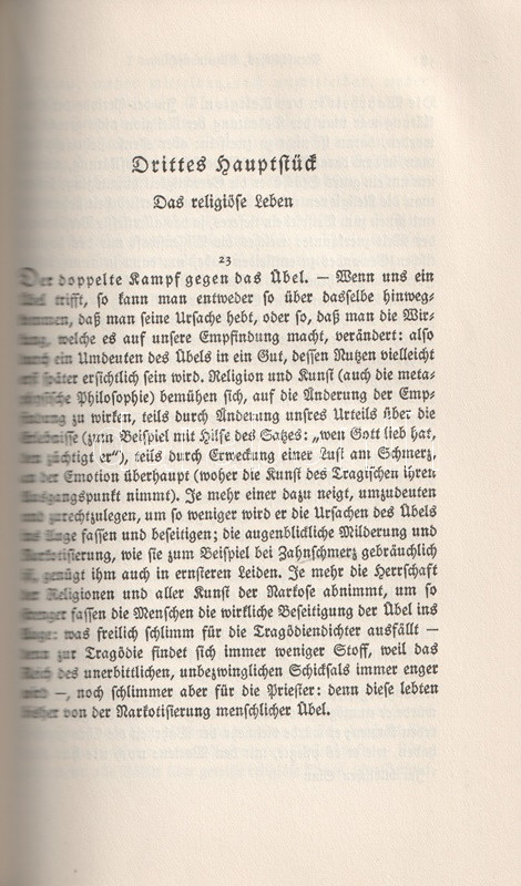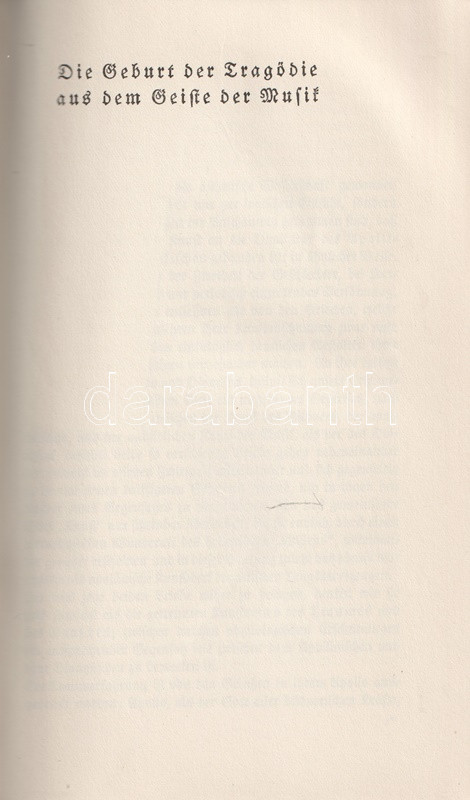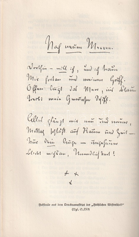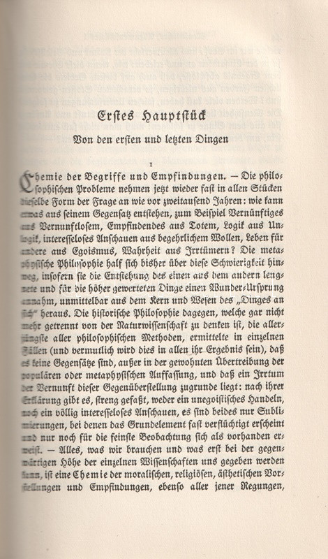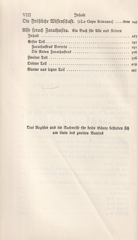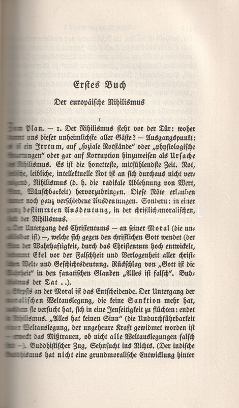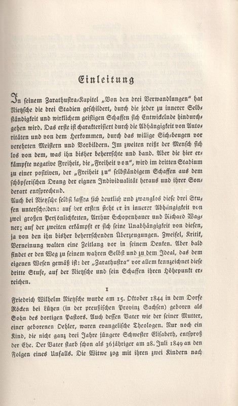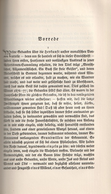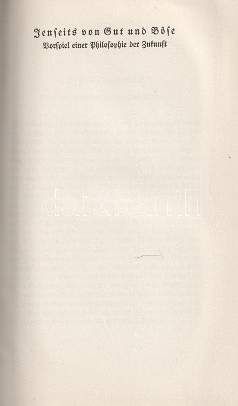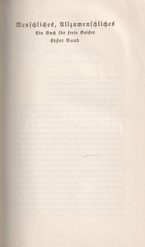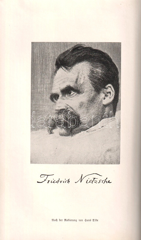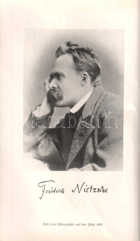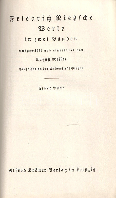 Bőrkötésű luxuskiadás. Az August Messer (1887-1937) német filozófiatörténész által szerkesztett munka Friedrich Nietzsche valamennyi filozófiai írását közreadja. Gót betűs szövegoldalakkal, a második kötet végén tárgymutatóval.