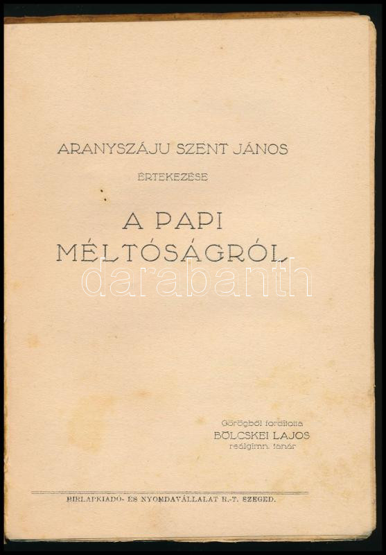 Aranyszájú Szent János értekezése a papi méltóságról. Ford.: Bölcskei ... https://www.darabanth.com/en/517-Auction-philately-postcards-numismatics-artwork-books-collectibles-jewelry/522.0/Books/Books-Religion~152/Aranyszaju-Szent-Janos-ertekezese-a-papi-meltosagrol-Ford-Bolcskei-Lajos-Szeged-1928-Szegedi~II3505028