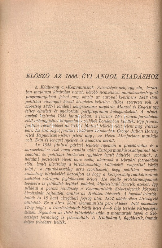 Minden idők egyik legnevezetesebb politikai kiáltványa eredeti nyelven először 1848-ban jelent meg; az osztályharc elméletét hirdető írást a 19. század folyamán számos nyelvre lefordították. A mű első magyar kiadása 1896-ban látott napvilágot, Krejcsi Rezső fordításában. Az első világháború utolsó évéig további változatok is megjelentek: Szabados Sándor, Kunfi Zsigmond és Kun Béla átültetésében. Újabb keletű, Rudas László-féle fordításunk a Kiáltvány százéves évfordulója alkalmából jelent meg, a kárpitosnak tanult Nemes Dezső moszkovita történész bevezetésével.