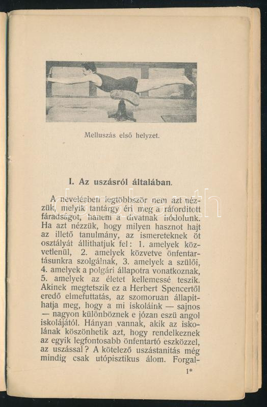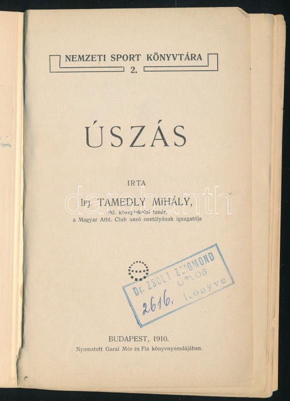 Ifj. Tamedly Mihály: Úszás. Nemzeti Sport Könyvtára 2. Bp., 1910, Garai Mór és Fia-ny., 67+5 p. + 1 (melléklet: Műugrások, az egyik felső sarkán hiánnyal, sérüléssel) t. Fekete-fehér szövegközti illusztrációkkal, Kiadói illusztrált papírkötés, kopott borítóval, a címlapon névbélyegzéssel, sérült kötéssel, kijáró lapokkal. Ritka!