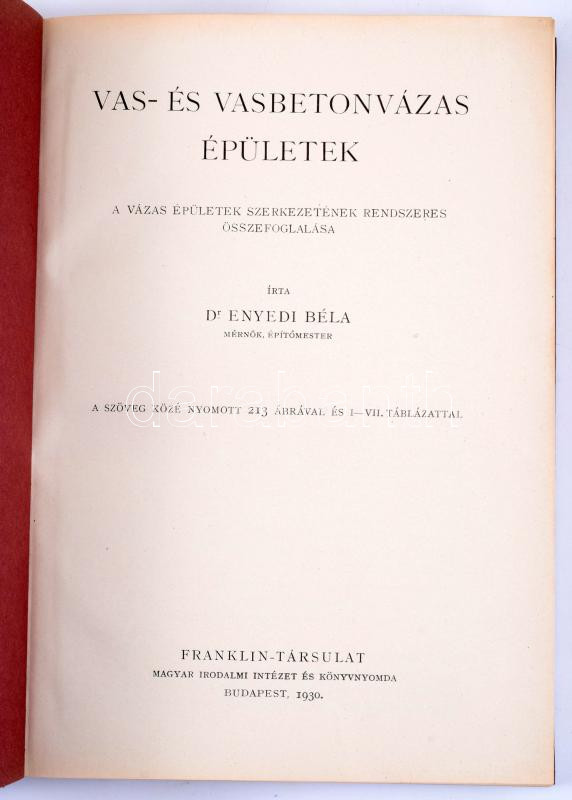 Description: Enyedi Béla: Vas- és vasbetonvázas épületek. A vázas épületek szerkezetének rendszeres összefoglalása. Bp., 1930, Franklin-Társulat, XVI+205+(3) p. Egyetlen kiadás. Szövegközti képekkel, ábrákkal illusztrálva. Kiadói egészvászon-kötés, jó állapotban.
