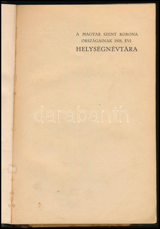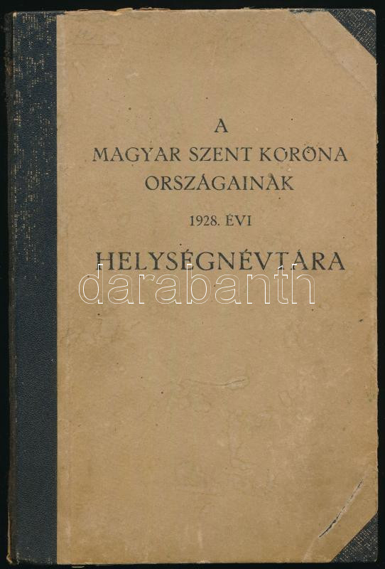 A magyar Szent Korona országainak 1928. évi helységnévtára. I. rész: Csonkamagyarország helységnévtára. Hivatalos adatok alapján szerk.: Várady Károly. Bp., 1928, Magyar Szent Korona Országai Helységnévtárának Kiadóhivatala (Fővárosi Nyomda Rt.), 138 p. Kiadói félvászon-kötés, kissé foltos, viseltes borítóval, sérült gerinccel, helyenként kissé foltos lapokkal.