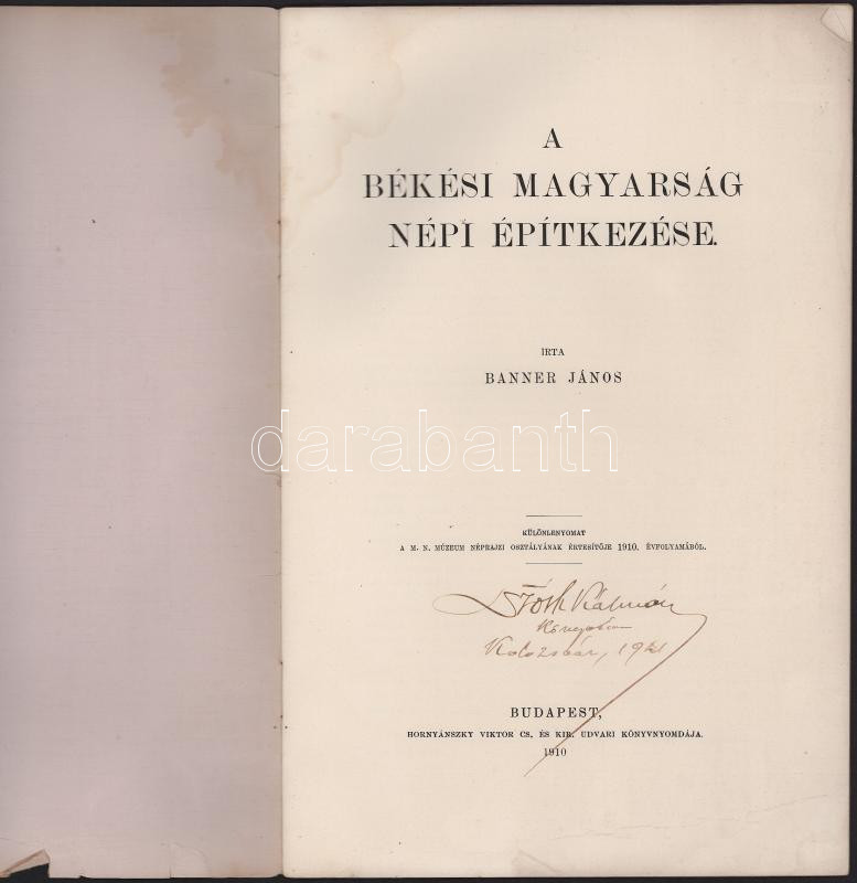 Banner János. A békési magyarság népi építkezése. Bp., 1910, Hornyánszky-ny., 23+[1] p. Fekete-fehér képekkel illusztrálva. Kiadói tűzött papírkötés, foltos, sérült borítóval, a lapok sarkán ázásnyommal, tulajdonosi bejegyzéssel.