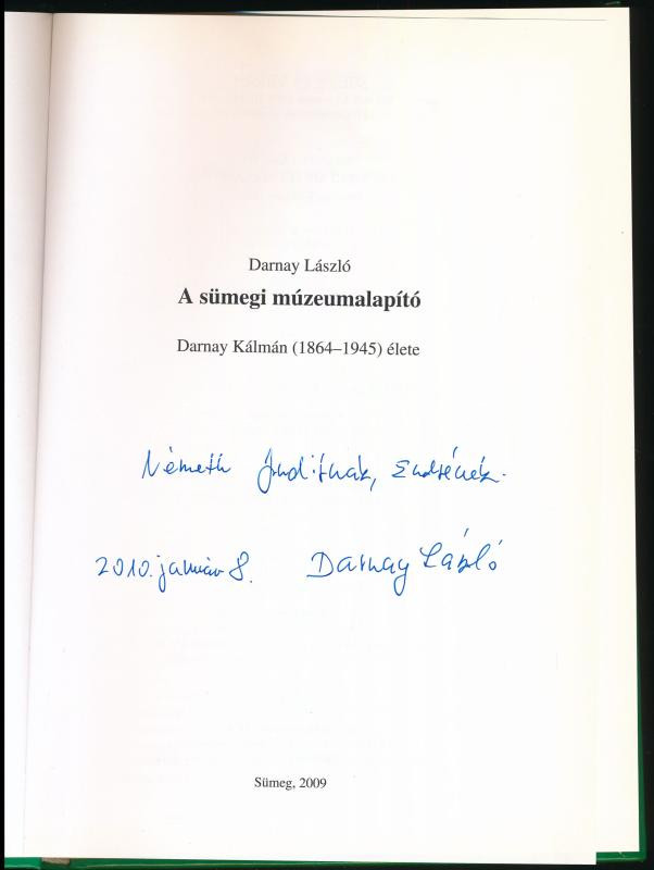Darnay László: A sümegi múzeumalapító. Darnay Kálmán (1864-1945) élete. A szerző által dedikált példány! Sümeg, 2009, Sümegi Fórum Alapítvány - Sümeg Város Önkormányzata, 193+[3] p. Kiadói kartonált papírkötés.