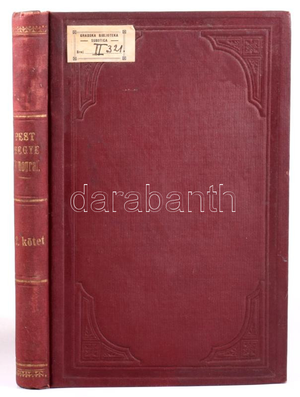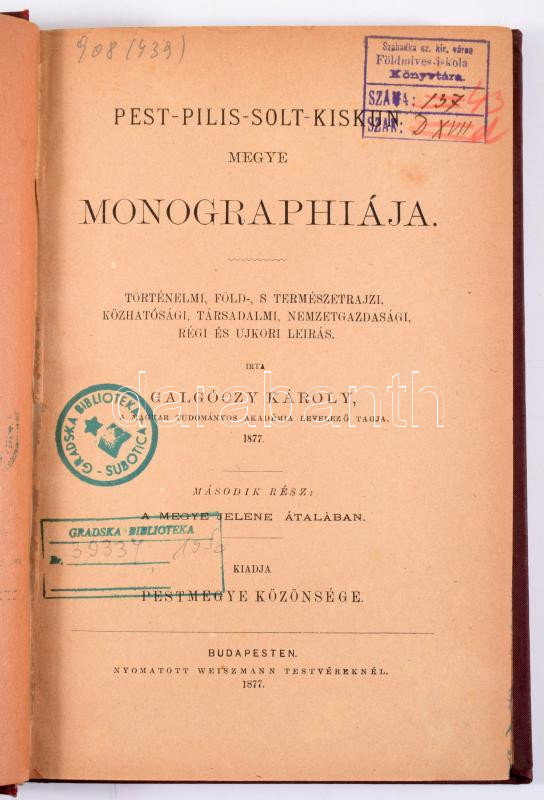 Galgóczy Károly: Pest-Pilis-Solt-Kiskun megye monographiája. Történelmi, föld-, s természetrajzi, közhatósági, társadalmi, nemzetgazdasági, régi és ujkori leírás. Második rész: A megye jelene általában. Bp., 1877., Weiszmann Testvérek, VIII+275 p. Korabeli aranyozott gerincű egészvászon-kötés, márványozott lapélekkel, kopott borítóval, a borítón címkével, régi intézményi bélyegzésekkel.
