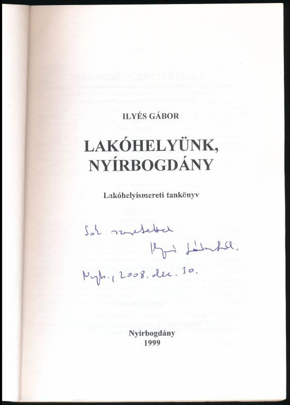 Ilyés Gábor: Lakóhelyünk, Nyírbogdány. Lakóhelyismereti tankönyv. A szerző által dedikált példány! Nyírbogdány, 1999, [Önkormányzat], 112 p. Egyetlen kiadás. Kiadói papírkötés.