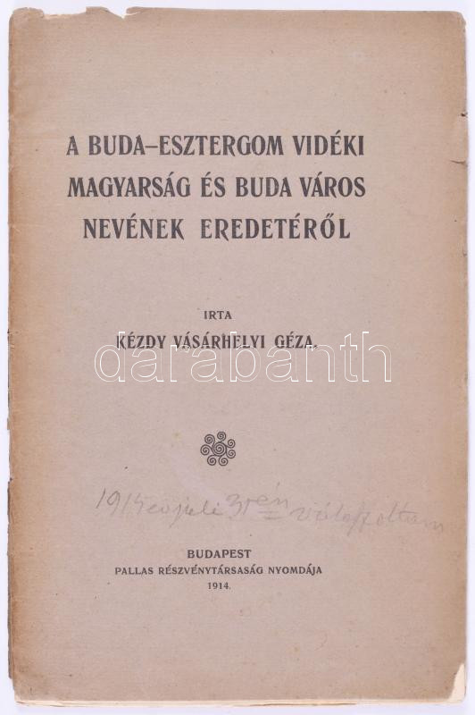 Kézdy Vásárhelyi Géza: A Buda-Esztergom vidéki magyarság és Buda város nevének eredetéről. Bp, 1914. Pallas. 38 l. Fűzve, feliratos, kiadói papírborítóban