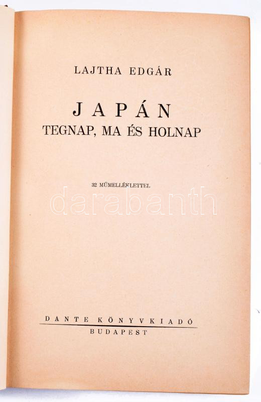 Lajtha Edgár: Japán tegnap, ma és holnap. Bp., 1936, Dante, 292 p.+16 (kétoldalas fekete-fehér képtáblák) t. Kiadói egészvászon-kötésben, foltos borító