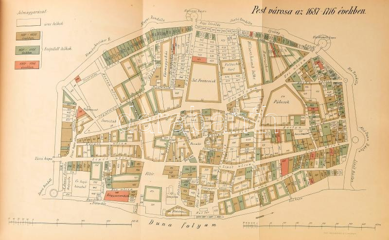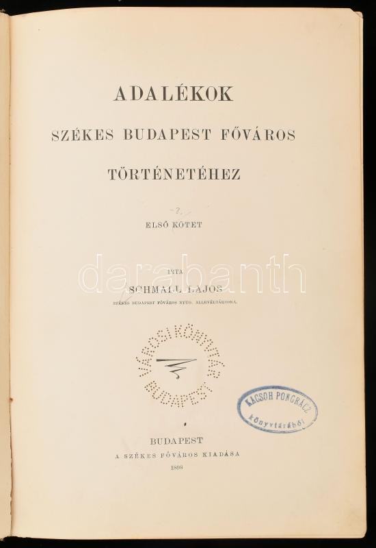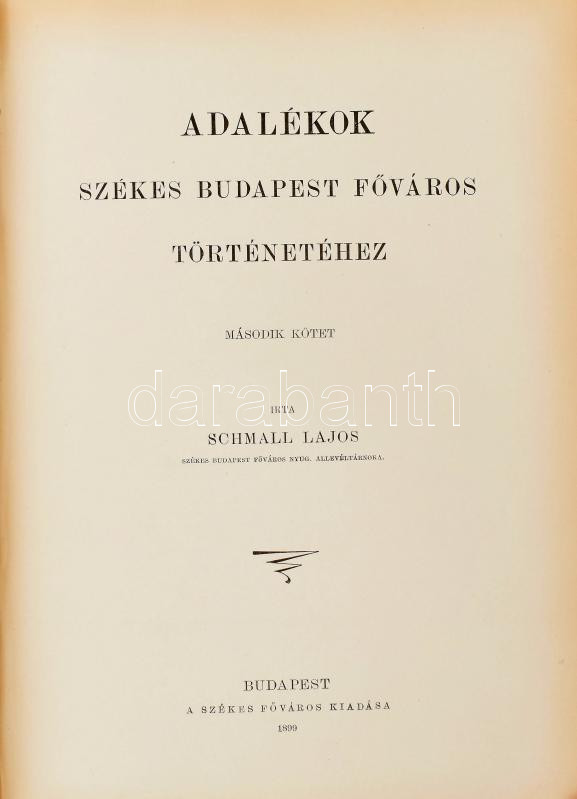 Schmall Lajos: Adalékok székes Budapest főváros történetéhez. I-II. köt. (egybekötve). Bp., 1898-1899, Székes Főváros kiadása (Pesti Könyvnyomda Rt.), (8)+335 p. + 1 térk. (színes, kihajtható); (8)+379+(1) p. Korabeli aranyozott gerincű egészvászon-kötésben, márványozott lapélekkel, kissé sérült borítóval, volt könyvtári példány.