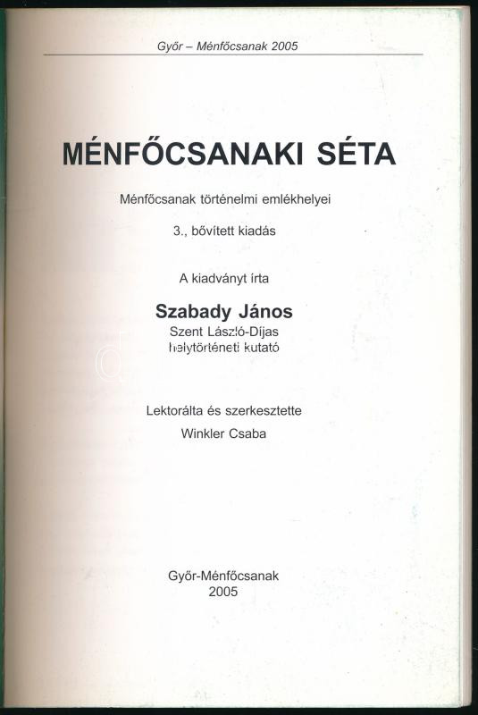 Szabady János: Ménfőcsanaki séta. Ménfőcsanak történelmi emlékhelyei. Győr-Ménfőcsanak, 2005, szerzői kiadás, 128 p. Kiadói papírkötés, kissé kopottas borítóval.