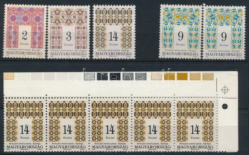 1995 Magyar Népművészet (III.) 2Ft, 3Ft és 14Ft 11 1/2 : 12 fogazással matt-fényes papíron, 2 db 9Ft + 14Ft hajtott 10-es csík fényes-matt papíron (12.200)
