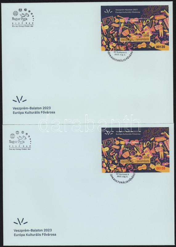 Description: 2023 Veszprém-Balaton Európa kulturális fővárosa 2 db blokk (Blokk A + Blokk B), fogazott és vágott, piros és fekete azonos sorszámmal 00135 2 db FDC-n