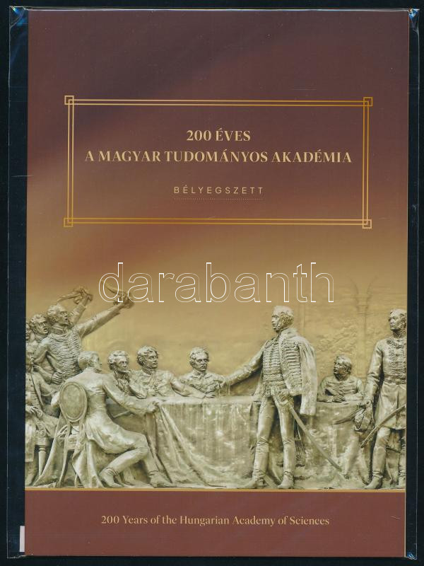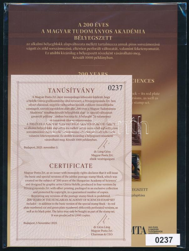 2025 200 éves a Magyar Tudományos Akadémia bélyegszett benne a blokk fekete sorszámmal, eltérő fogazású blokk zöld sorszámmal, vágott blokk piros sorszámmal és feketenyomat blokk. 1.000 példányban készült. / 200 Years of the Hungarian Academy of Sciences presentetion pack including block with black number, block with special perforation and green number, imperforate block with red number and blackprint block. Issue: 1.000