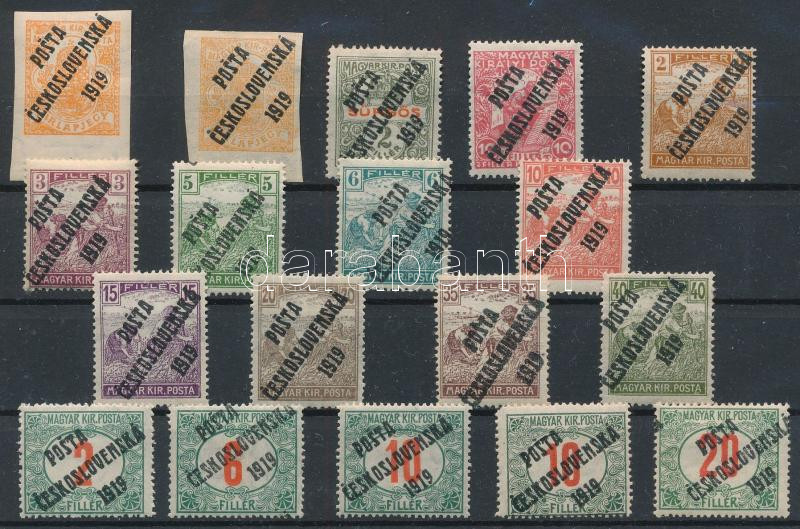 Posta Ceskoslovenska 1919 18 db bélyeg, közte elcsúszott felülnyomatok, lemezhibák mind Bodor vizsgálójellel (16.400)