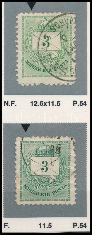 1874/1881 2 db 3kr látványos felül végigfutó javítással (ex Orbán, Sebestyén kiállítási anyagból)