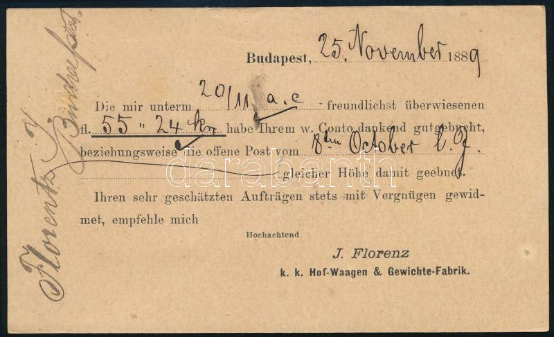 1889 Díjjegyes levelezőlap, hátoldalon céges nyomtatott szöveggel, "BUDAPEST FŐPOSTA / ESTE" - Javorina