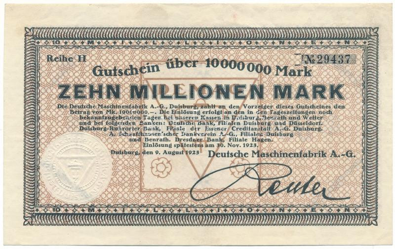 Germany / Weimar Republic / Duisburg 1923. 10.000.000 Mark with embossed stamp C:F fine paper