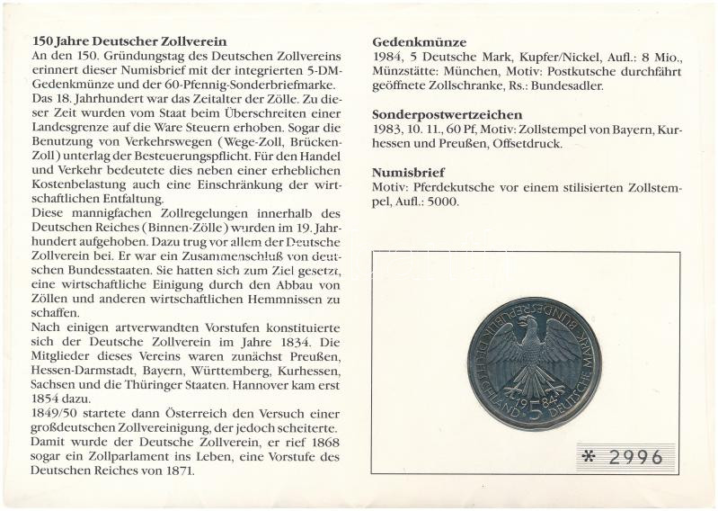 Német Szövetségi Köztársaság 1984D 5M Cu-Ni "Német Vámunió 150. évfordulója" érmés borítékban, bélyeggel és bélyegzéssel T:AU patina