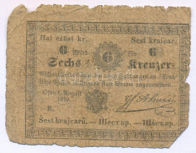 https://www.darabanth.com/en/517-Auction-philately-postcards-numismatics-artwork-books-collectibles-jewelry/522.0/Numismatics/Hungarian-Banknotes~474/1849-6kr-Almasy-E-sorozat-T-VG-GHungary-1849-6-Kreuzer-Almasy-E-prefix-C-VG-GAdamo-G100~II3479693