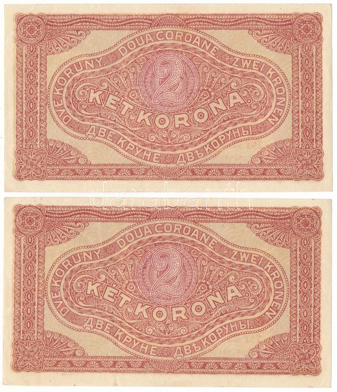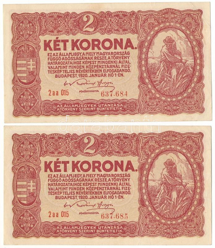 Hungary 1920. 2 Korona (2x) consecutive serials "2aa 015 637.684 - 2aa 015 637.685" C:XF unfolded but with some creases along the edges
