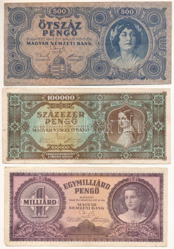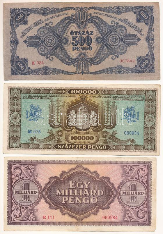 1945. 500P magyar "N" betű orosz "P" helyett + 100.000P + 1.000.000.000P T:F közte szép papír