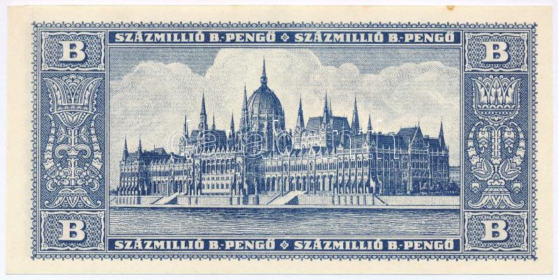 1946. 100.000.000BP A 100 millió B-Pengős a Magyar Nemzeti Bank által - a II. világháborút követő hazai hiperinflációs időszak során - kibocsátott, a mai napig is a világ legnagyobb névértékű, még forgalomba került bankjegye. A Pengő ezekben a hónapokban olyan sebességgel veszített az értékéből, hogy egymás után, gyakorlatilag pár hetente jelentek meg az egyre nagyobb névértékű bankók. Ennek köszönhetően a Pengő hattyúdala során megfigyelhető érdekesség, hogy az egyes nagyságrendekben megjelent 100 milliós névérték a grafikai elemeket közel változatlanul hagyta, a névértéken kívül az egyetlen változás a papírpénzek eltérő színe: a 100 millió Pengő sárga-barna, a 100 millió Milpengő zöld, míg a jelen aukciónk tárgyát képező 100 millió Bilpengő kék színváltozatban került forgalomba. T:AU folt