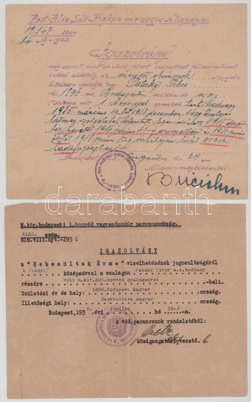 1926-1936. Névre szóló, kitöltött viselői igazolvány a Sebesültek érmé... https://www.darabanth.com/en/517-Auction-philately-postcards-numismatics-artwork-books-collectibles-jewelry/522.0/Numismatics/Military~486/1926-1936-Nevre-szolo-kitoltott-viseloi-igazolvany-a-Sebesultek-ermehez-plus-igazolas-tenyleges~II3507707