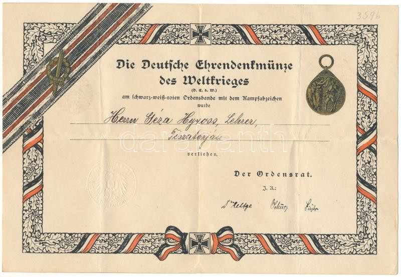 Német Birodalom 1928. "Német háborús érdemérem" adományozói okirata T:...