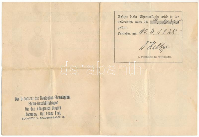 Német Birodalom 1928. "Német háborús érdemérem" adományozói okirata T:XF