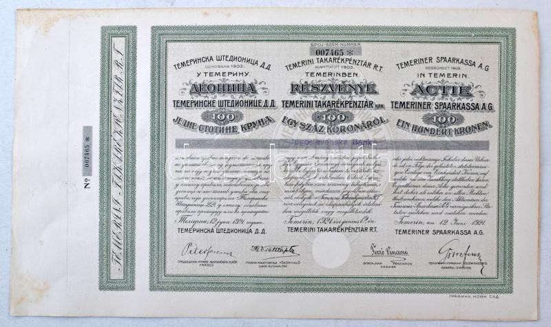 Description: Szerbia / Temerin 1921. "Temerini Takarékpénztár R.T. " részvénye 100K-ról, bélyegzésekkel, szárazpecséttel, néhány szelvénnyel T:XF