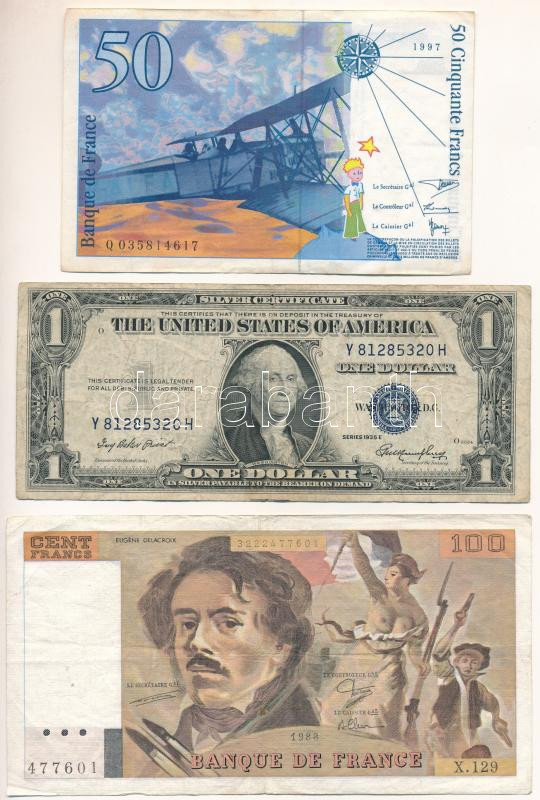 Description: Amerikai Egyesült Államok 1935E 1$ "Silver Certificate", kék pecsét + Franciaország 1997. 50Fr + 1988. 100Fr T:F