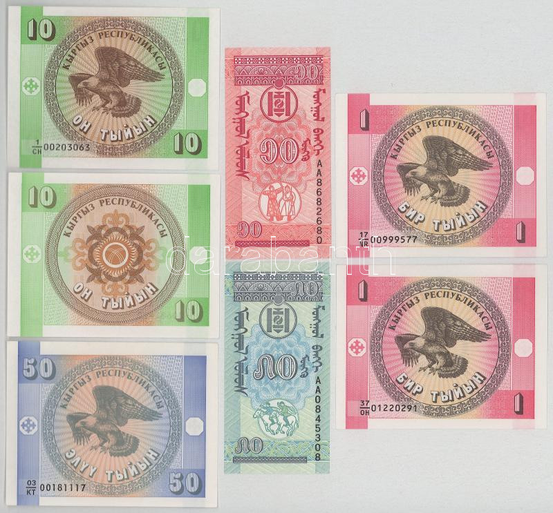 Kirgizisztán DN(1993) 1T (2x) + 10T (2x) + 50T + Mongólia DN (1993) 10m + 50m T:UNC-XF