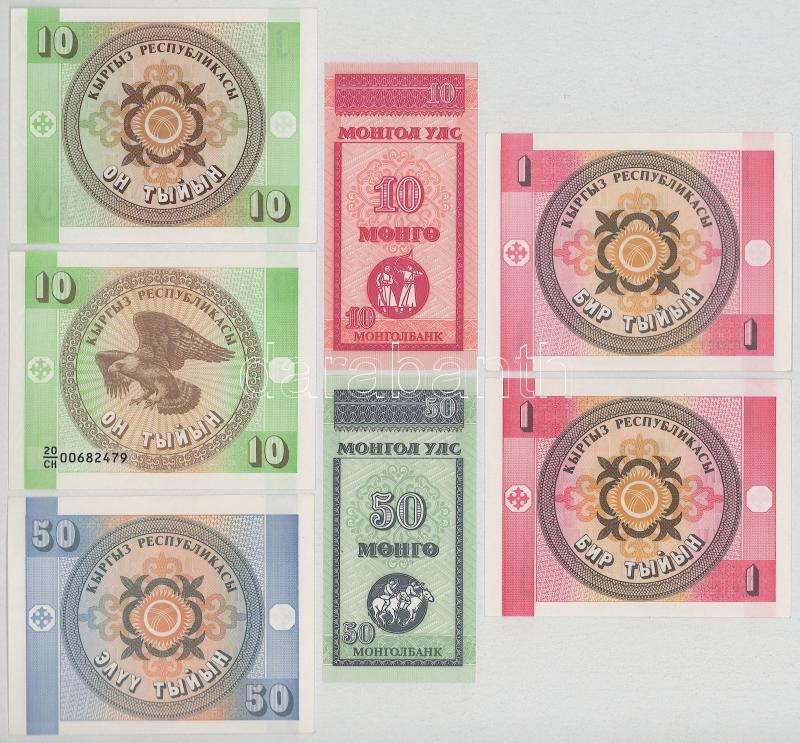Kyrgyzstan ND(1993) 1 Tyiyn (2x) + 10 Tyiyn (2x) + 50 Tyiyn + Mongolia ND (1993) 10 Möngö + 50 Möngö C:UNC-XF