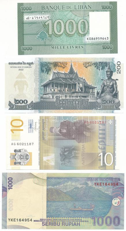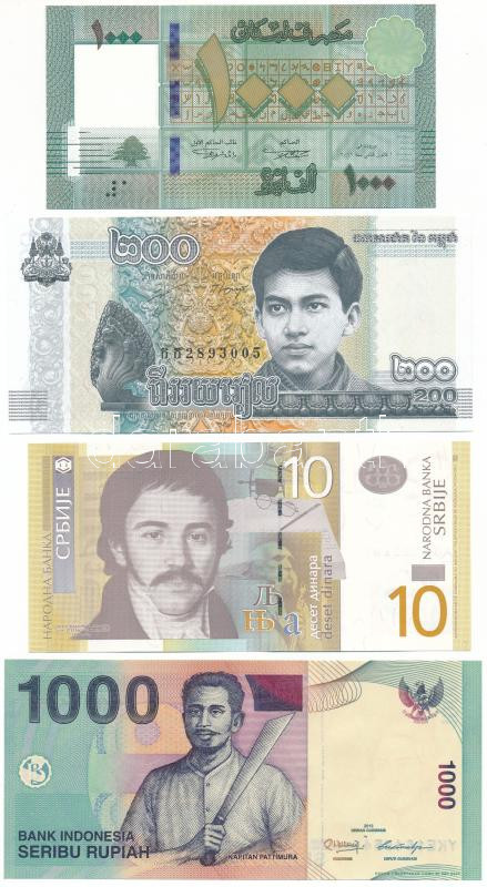 Szerbia 2013. 10D + Kambodzsa 2022. 200R + Libanon 2016. 1000L + Indonézia 2013. 1000R T:UNC-AU