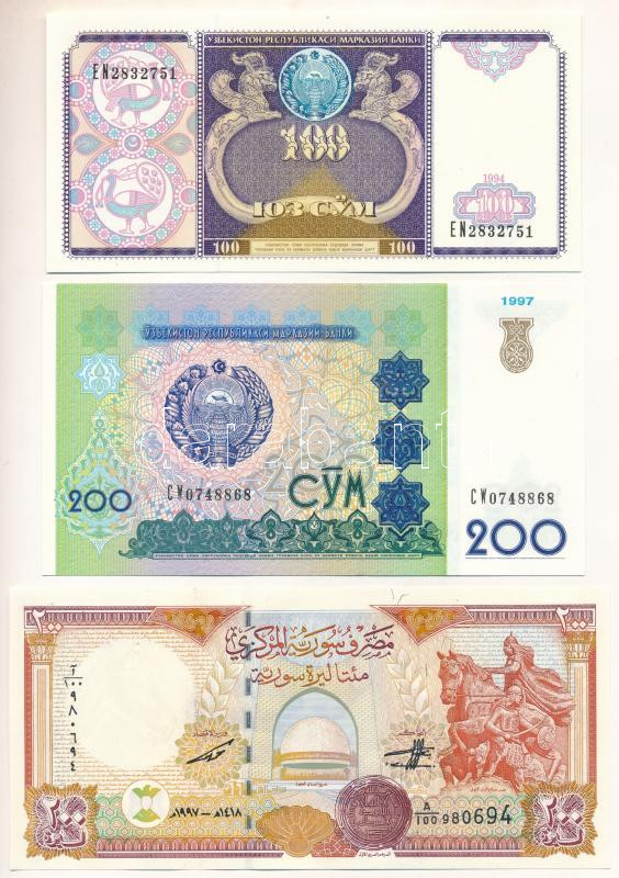 Uzbekistan 1994. 100 So'm + 1997. 200 So'm + Syria 1997. 200 Pounds C:UNC-AU