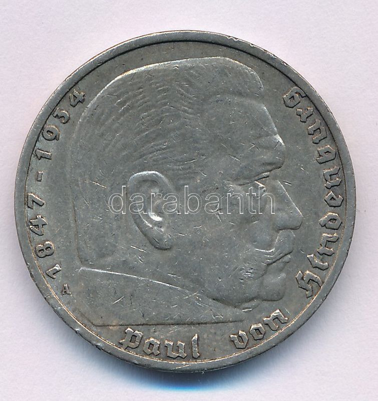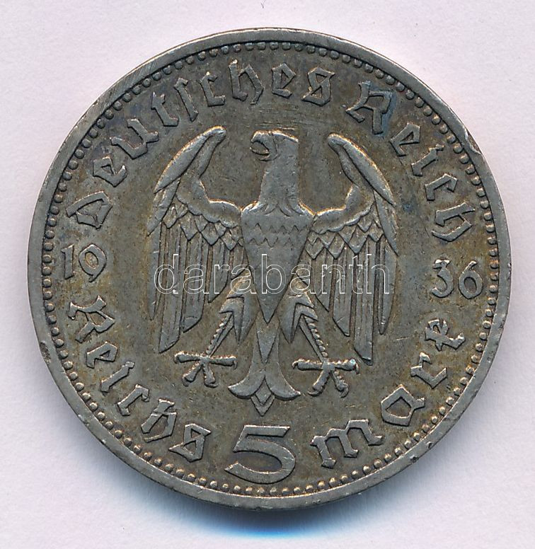 German Third Reich 1936A 5 Reichsmark Ag "Paul von Hindenburg" C:XF patina, small edge error