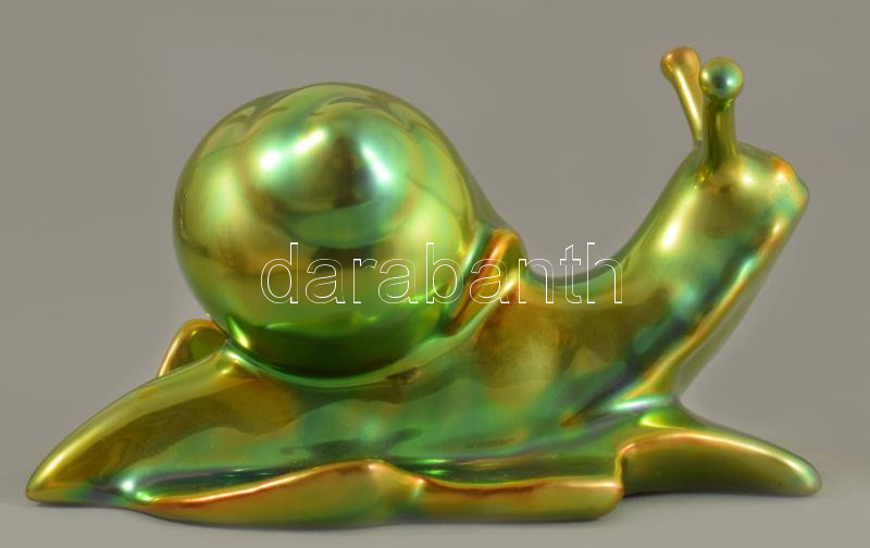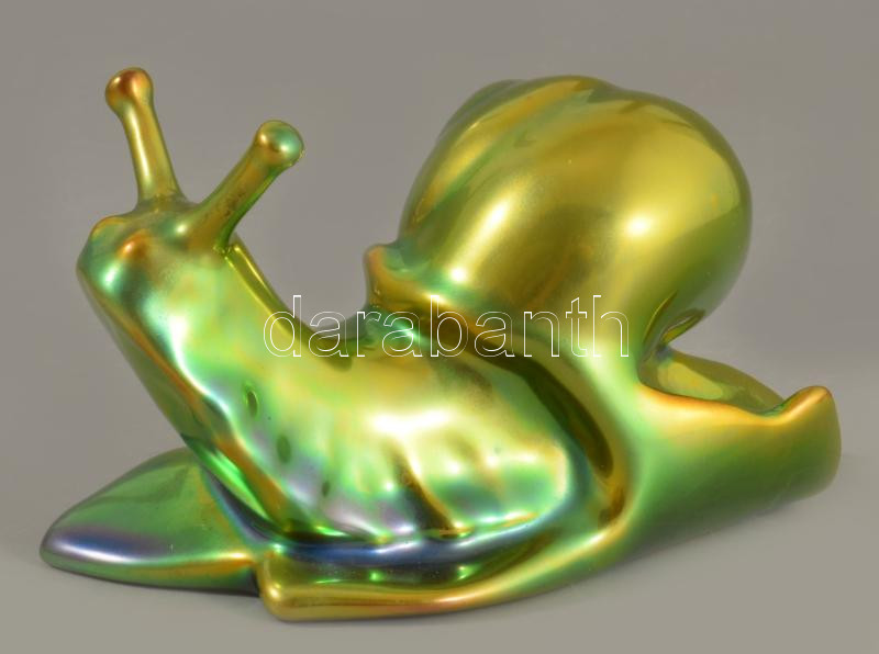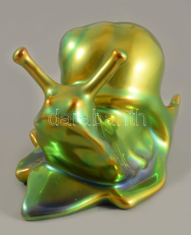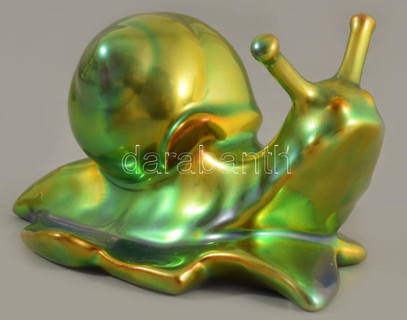Zsolnay kisplasztika - Éti csiga. Selyemfényű eozin mázakkal fedett finomfajansz, jelzett, hibátlan, 11x6 cm