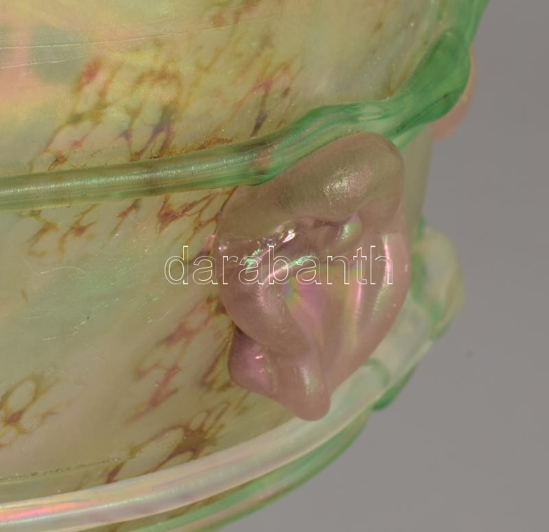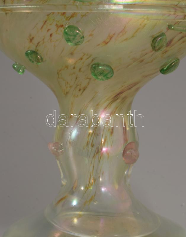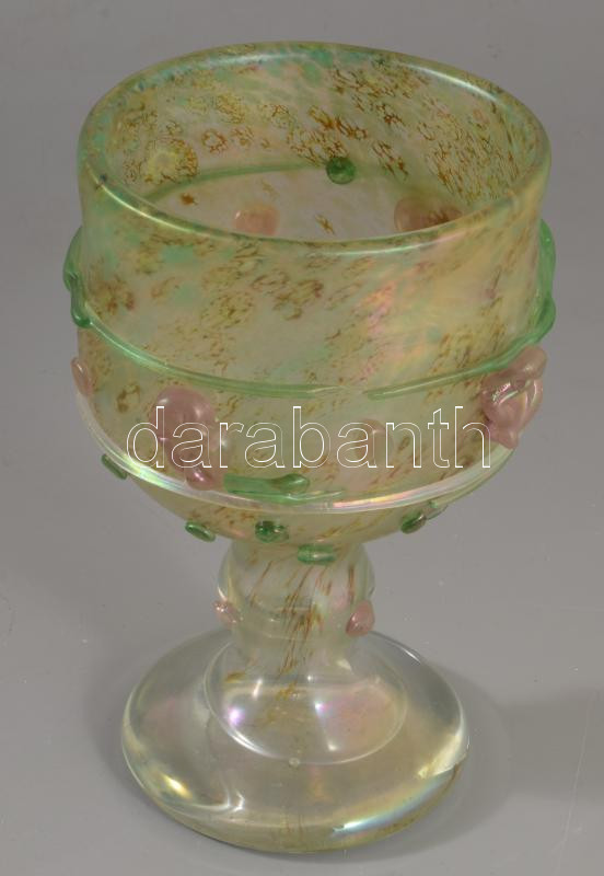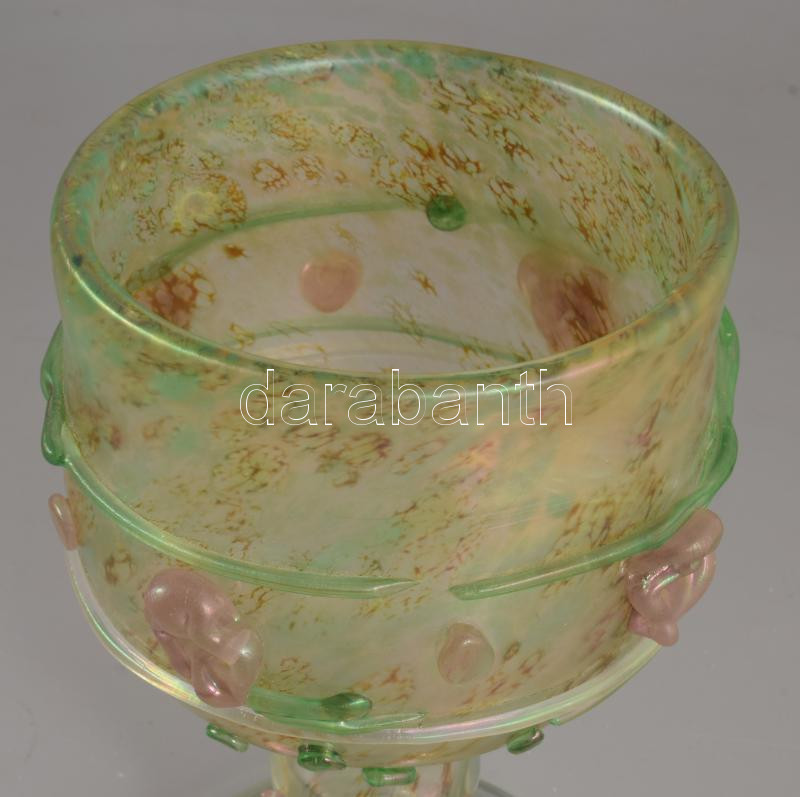 Smetana Ágnes (1961-) Kehely plasztikus virág díszítéssel. Anyagában színezett, üvegszál ráillesztésekkel díszített, kézzel formázott hutaüveg. Jelzés nélkül, m: 19 cm