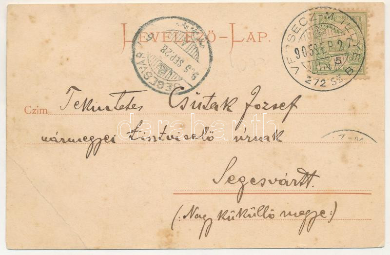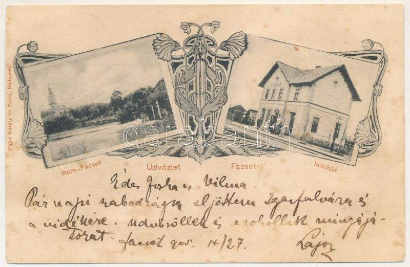1905 Facset, Facsád, Faget; templom, vasútállomás, indóház. Weisz Károly és társa kiadása / church, railway station. Art Nouveau, floral + "VERSECZ - M.ILLYE 272 SZ. B" vasúti mozgóposta bélyegző (EB)