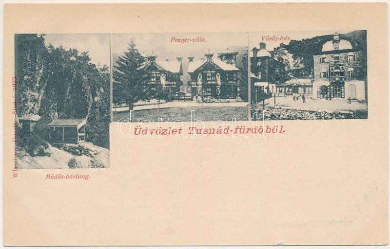 Tusnádfürdő, Baile Tusnad; Büdös-barlang, Präger-villa, Vörös-ház. Wlaszlovits Gusztáv kiadása / cave, villas (kis szakadás / small tear)