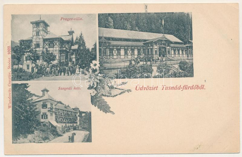 Tusnádfürdő, Baile Tusnad; Präger-villa, Szegedi-ház. Wlaszlovits Gusztáv kiadása / villas. floral