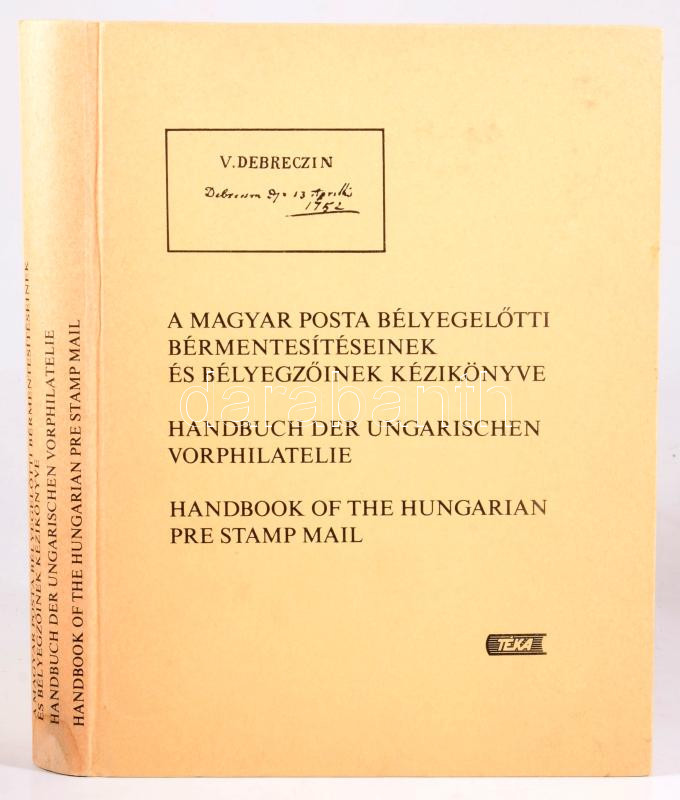 A magyar posta bélyegelőtti bérmentesítéseinek és bélyegzőinek kézikönyve. / Handbuch der Ungarischen Vorphilatelie. / Handbook of the Hungarian Pre Stamp Mail. [Bp., 1990], Téka, 455 p. Magyar, német és angol nyelven. Kiadói kartonált papírkötés, a gerincen kisebb folttal.