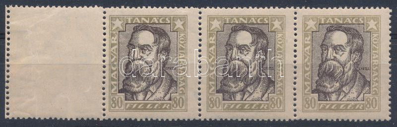 1919 Magyar Tanácsköztársasági arcképek 80f 3-as csík bal oldalon üres mezővel, álló vízjellel, papírránccal (76.000)