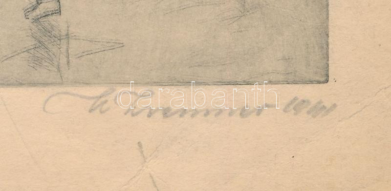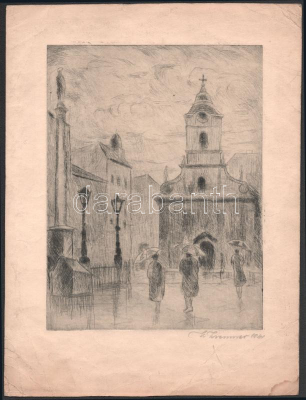 Olvashatatlan jelzéssel: Járókelők az esőben. Rézkarc, papír, jelzett, lapszéli törésnyomokkal és ázásfolttal, 23,5x18 cm