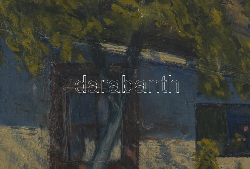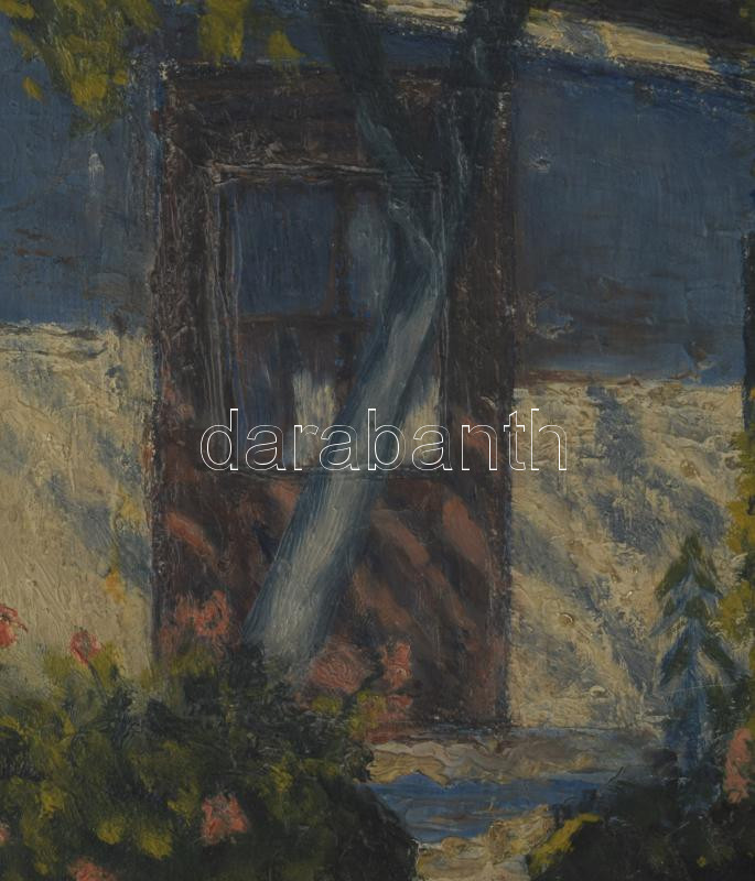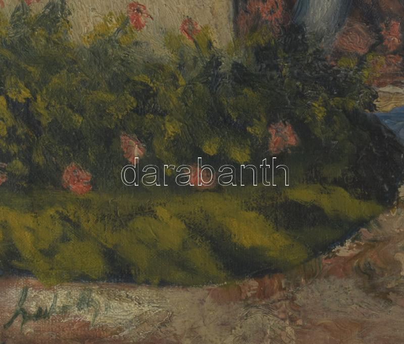 Olvashatatlan jelzéssel: Virágos udvar. Olaj, vászon. Kissé sérült. Dekoratív, kissé sérült fakeretben, 50×40 cm
