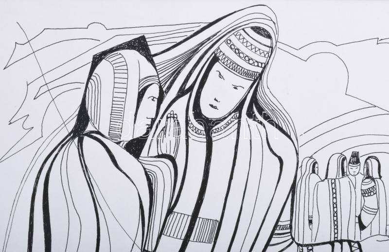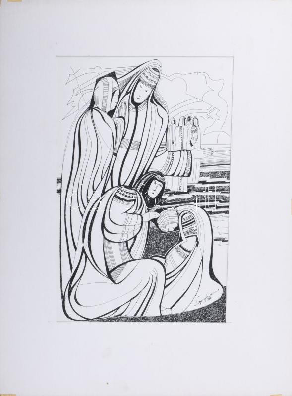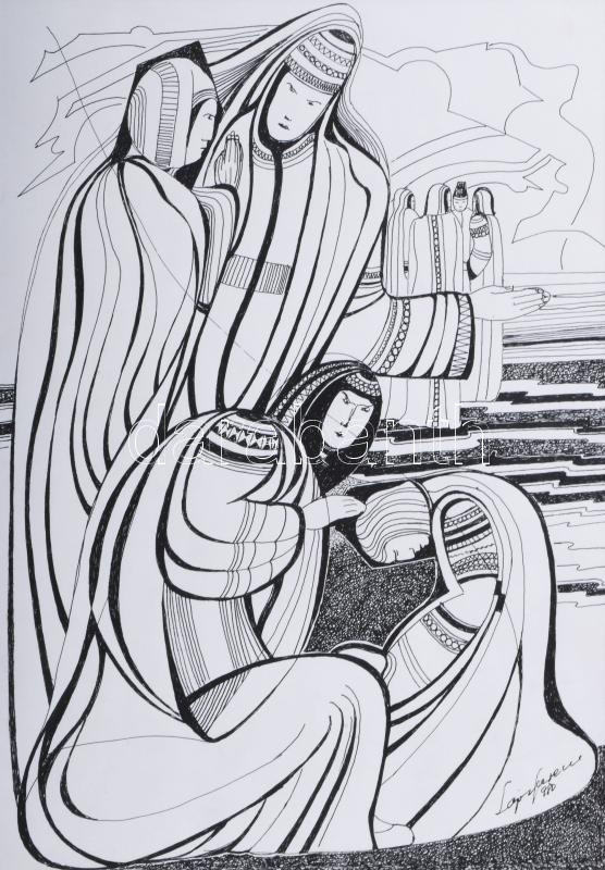 Lajos Ferenc (1912-1998): Társaság a szabadban, 1980. Tus, papír, jelz...